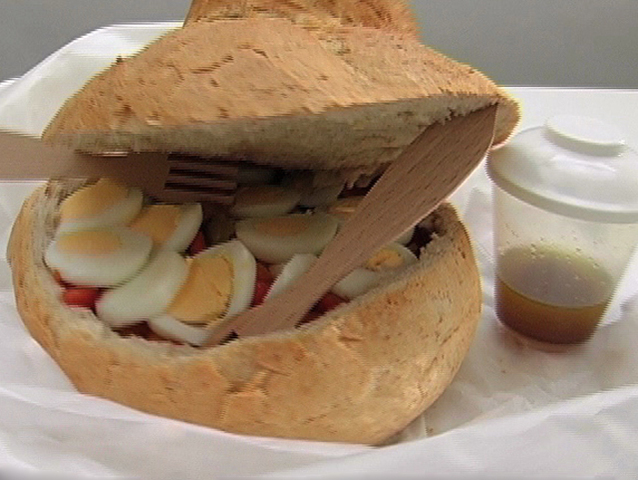 Пикник в итальянском стиле только с «Пан-багнат».Состав:яйца — 2 штуки;хлеб — 1 батон;помидор — 1 штука;оливки — 2 столовых ложки;чеснок — 1 зубчик;анчоусы в масле — 6 кусочков;лук — 1 штука;сладкий перец — 1 штука;соль, оливковое масло, вишневый уксус — по вкусу.