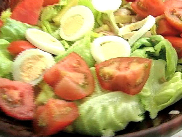 Рецепт легкого и свежего салата.Состав: яйца — 2 штуки;ветчина — 3 кусочка;грюэрский сыр — 3 кусочка;салат-латук — 1 качан;помидора — 3 штуки;чеснок — 2 зубчика;морская соль, белый перец, оливковое масло, уксус хереса.
